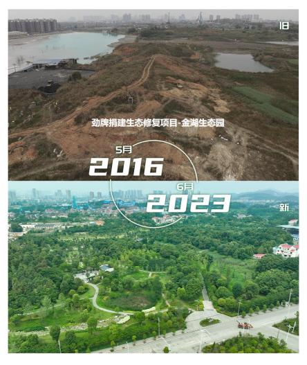 為回報社會,同時響應我市當時“生態(tài)立市,產(chǎn)業(yè)強市”的號召,勁牌公司決定捐資對金湖街道石頭咀一帶的采礦區(qū)進行生態(tài)修復,并對周邊鄉(xiāng)村進行美麗鄉(xiāng)村改造,將這里打造成青山碧水、宜業(yè)宜居的家園。在市政府的主導及支持下,歷經(jīng)多年的整治、修復、升級,終于補齊了生態(tài)欠賬、還原了生態(tài)綠色,變成如今的金湖生態(tài)園。