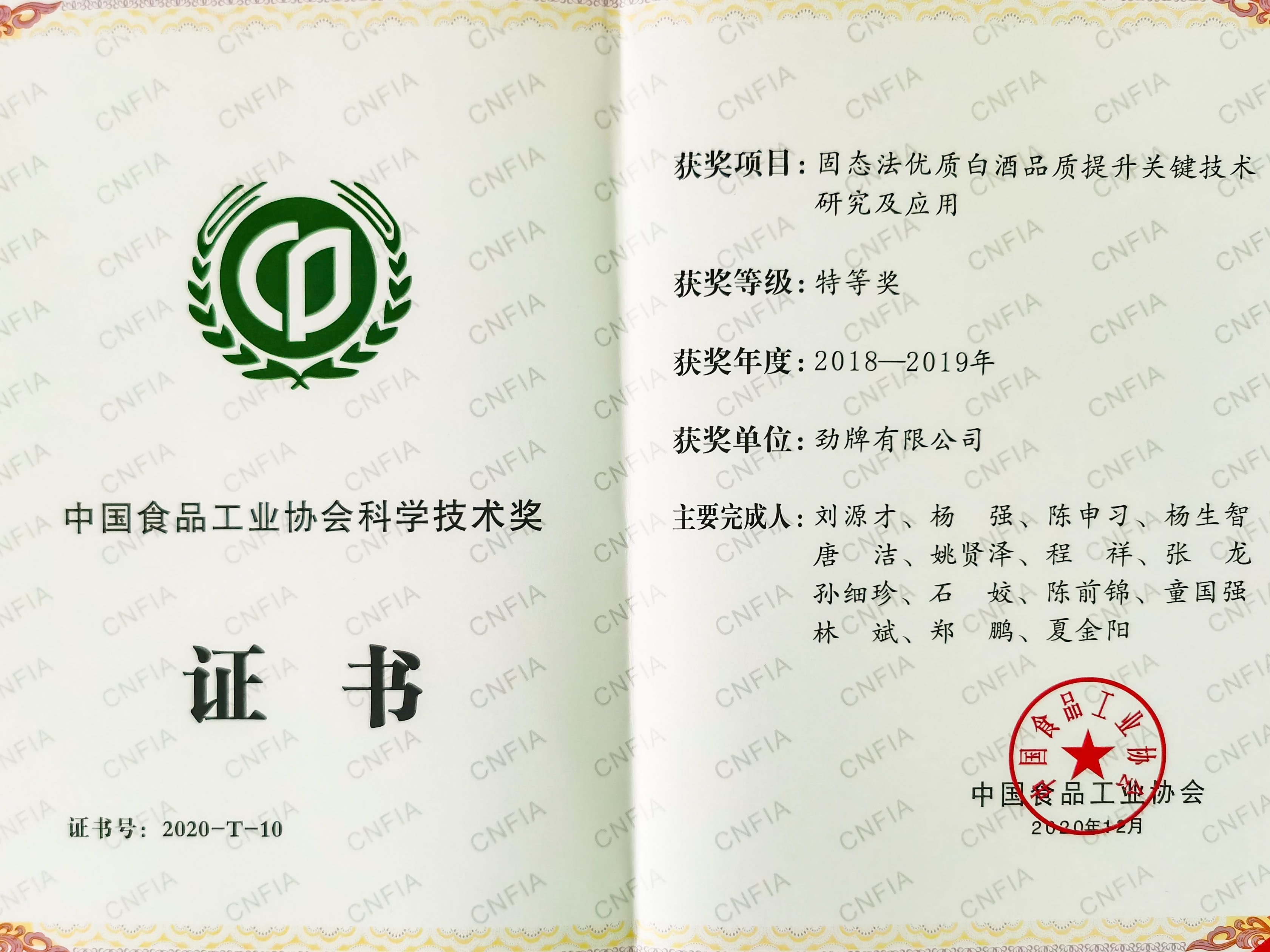 12月6日,2020第四屆中國(guó)食品產(chǎn)業(yè)發(fā)展年會(huì)暨華糖萬(wàn)商大會(huì)全會(huì)在河南鄭州開(kāi)幕。大會(huì)頒發(fā)了2020年度“中國(guó)食品工業(yè)協(xié)會(huì)科學(xué)技術(shù)獎(jiǎng)”,勁牌公司《固態(tài)法優(yōu)質(zhì)白酒品質(zhì)提升關(guān)鍵技術(shù)研究及應(yīng)用》項(xiàng)目榮獲特等獎(jiǎng)。